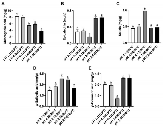Effect of pH and temperature on the content of phenolic compounds: chlorogenic acid (A), epicatechin (B), salicin (C), p-salicylic acid (D), and p-coumaric acid (E) in the willow infusions. Different letters (a–c) indicate significant differences (p < 0.05).