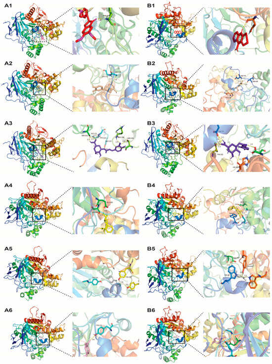The docking poses of different ligands with their receptors: (A) AChE and (B) BuChE in total and detailed view. (A1) represents donepezil (red sticks) docked into the active site of AChE. (B1) represents tacrine (red sticks) docked into the active site of BuChE. (A2) and (B2) epicatechin (wheat sticks) docked in the active sites of AChE and BuChE. (A3) and (B3) represent chlorogenic acid (purple sticks) docked in the active sites of AChE and BuChE. (A4) and (B4) represent salicin (yellow sticks) docked in the active sites of AChE and BuChE. (A5) and (B5) represent p-coumaric acid (white sticks) docked in the active sites of AChE and BuChE. (A6) and (B6) represent p-salicylic acid (light pink sticks) docked in the active sites of AChE and BuChE.