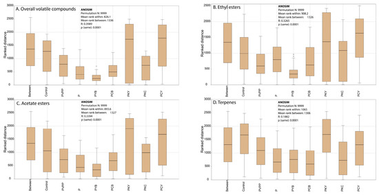 For the eight wine variants and their repetitions, the total chromatographic peak areas were grouped together for overall volatile compounds included in Table 3, as well as for all the identified ethyl esters, acetate esters, and terpenes. The wine variants were compared based on the peak area averages of overall volatile compounds (Figure 1A) and of main classes of compounds (Figure 1B–D) using multivariate analysis of similarity (ANOSIM). For an easy data interpretation, box-and-whisker plots (Figure 1) of inter-group and intra-group ranked distances of various chromatographic peak areas were created and the dissimilarity values R and the Bonferroni adjusted significance level were calculated (Table 4).