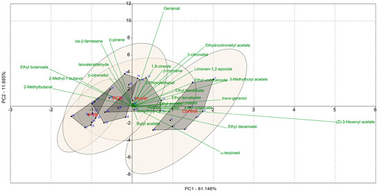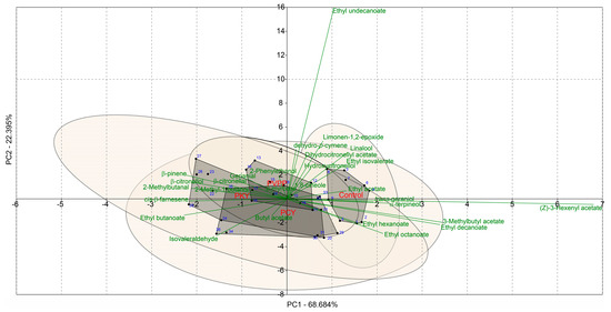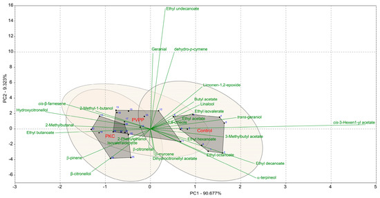 Considering the fact that PKC had a major effect on all types of volatiles for its PCA, the overall volatile profile was used (Figure 2). It can be observed that the principal component 1 explains most of the variance (90.68%). The other principal component (PC2) explains only 9.32% of the variance and is especially determined by some compounds such as geranial, ethyl undecanoate, and dehydro-p-cymene. No clear separation of terpene and esters is obtained after the PCA, both principal components depending on substances from all volatile classes determined by gas chromatography.