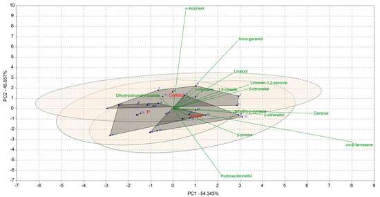 Regarding the treatment with pea protein only, as the ANOSIM analysis proved, the most affected compounds were the terpenes. Therefore, the PCA for the treatment with P, compared to PVPP and control wines, took into account only the identified volatile terpenes (Figure 4).