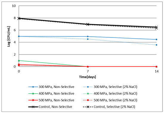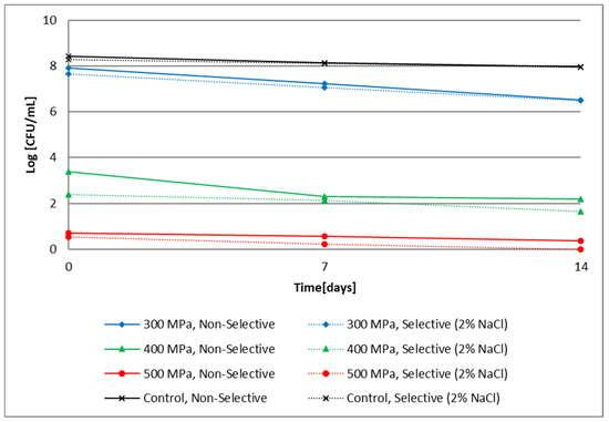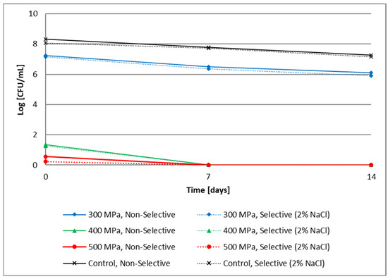 The number of total viable cells was determined using the pour plate method in MRS agar medium according to PN ISO 15214: 2002 [36], while the number of noninjured cells in the population was determined using MRS agar medium with 2% NaCl. The first medium is a non-selective one that allows the growth of all viable cells in the sample. The second is a selective medium that contains NaCl, impairing the microorganisms’ ability to self-repair. The 2% concentration of NaCl was estimated in the laboratory as the maximum concentration that did not change the morphology and number of unstressed Lb. brevis. The plates were incubated in anaerobic conditions for 72 ± 3 h at 30 °C. The effectiveness of HHP treatment was measured by bacterial inactivation. The inactivation of bacterial cells after HHP was calculated based on the number of bacteria before (N0) and after (N) treatment obtained on non-selective MRS agar and expressed as log (CFU/mL) according to the following Equation (1):