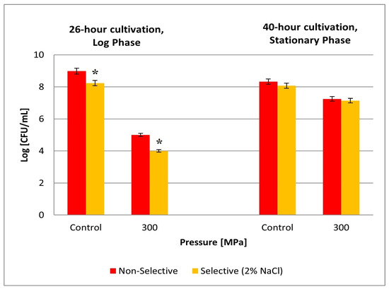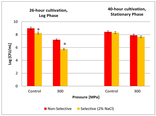 Effect of pressure on the survivability and sublethal injuries of Levilactobcillus brevis KKP 3574 in Vienna Lager beer, depending on the growth phase. Asterisks (*) indicate statistically significant differences (p < 0.05) between non-selective and selective media. The absence of asterisks denotes no statistically significant difference.