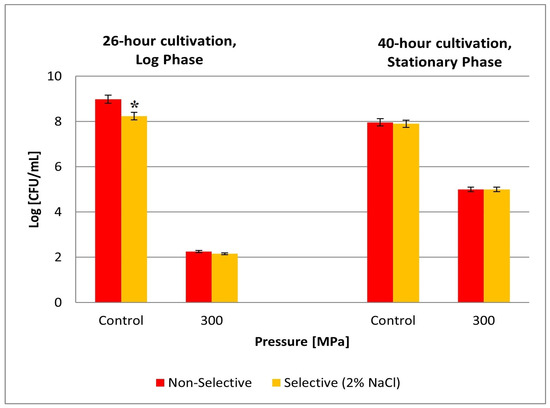 To investigate the effect of HHP on the survivability and sublethal injuries of Lb. brevis KKP 3574 depending on the growth phase, the pressure of 300 MPa for 5 min was chosen. To this, the 8–9 log [CFU/mL] Lb. brevis KKP 3574 cells from a 26 h culture in the logarithmic growth phase and a 40 h culture in the stationary phase were used.