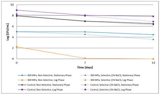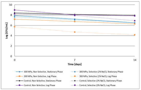Lb. brevis KKP 3574 cell samples in the 10% wort and Vienna and Pale Lager beers were refrigerated and stored for 14 days to observe the effect of storage time on the survivability and sublethal injuries depending on the growth phase under the pressure of 300 MPa for 5 min.