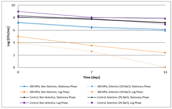 After 14 days of refrigerated storage, the number of HHP-treated bacterial populations from the stationary phase decreased by 1.39 log [CFU/mL], while the changes in the level of sublethal injuries during storage were not statistically significant (p ≥ 0.05). However, cells from logarithmic growth phase cultures decreased by 0.91 log [CFU/mL]. The number of sublethally injured cells increased with prolonged storage time, from 1.46 log [CFU/mL] immediately after pressurization to 2.06 log [CFU/mL] after 7 days of storage and to 2.13 log [CFU/mL] after 2 weeks.
