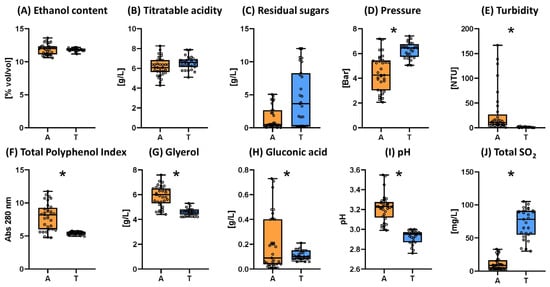 Box plots for standard parameters of sparkling wines elaborated by ancestral (A, n = 11) or traditional (T, n = 9) methods. The presence of an asterisk indicates the existence of significant differences at p < 0.05.