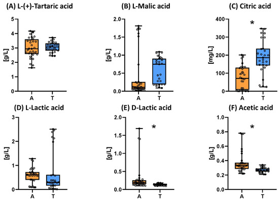 Box plots for organic acids of sparkling wines elaborated by ancestral (A, n = 11) or traditional (T, n = 9) methods. The presence of an asterisk indicates the existence of significant differences at p < 0.05.