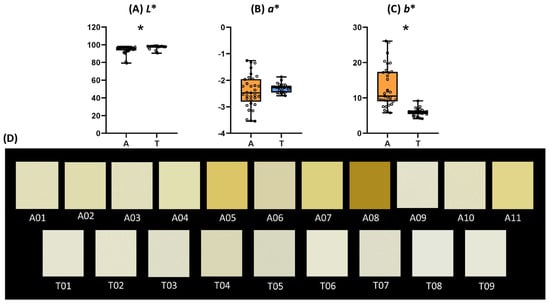 Box plots for color coordinates (A–C) and the palette of colors in RGB signals (D) of sparkling wines elaborated by ancestral (A, n = 11) or traditional (T, n = 9) methods. The presence of an asterisk indicates the existence of significant difference.