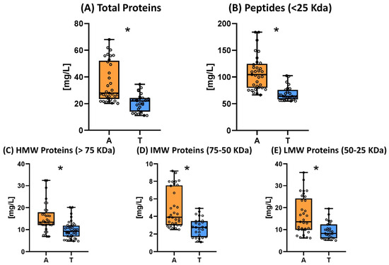 Box plots for proteins and peptides of sparkling wines elaborated by ancestral (A, n = 11) or traditional (T, n = 9) methods. The presence of an asterisk indicates the existence of significant differences at p < 0.05.