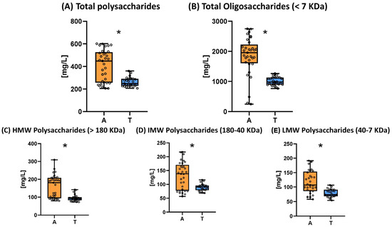 Box plots for polysaccharides and oligosaccharides of sparkling wines elaborated by ancestral (A, n = 11) or traditional (T, n = 9) methods. The presence of an asterisk indicates the existence of significant differences at p < 0.05.
