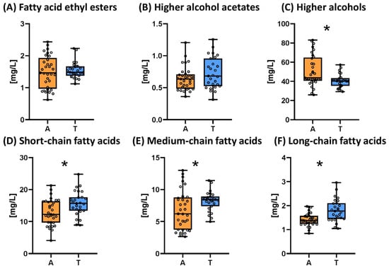 Box plots for volatile substances of sparkling wines elaborated by ancestral (A, n = 11) or traditional (T, n = 9) methods. The presence of an asterisk indicates the existence of significant differences at p < 0.05.