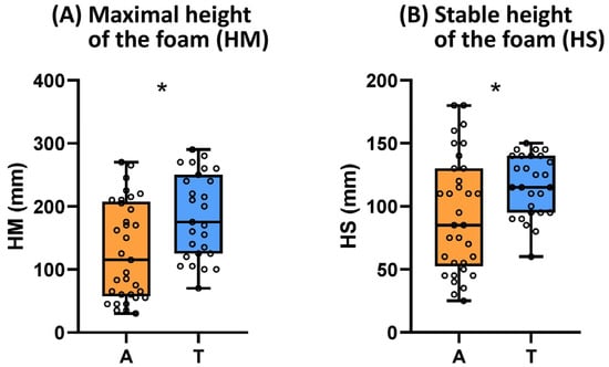 Box plots for the foaming properties of sparkling wines elaborated by ancestral (A, n = 11) or traditional (T, n = 9) methods. The presence of an asterisk indicates the existence of significant differences at p < 0.05.