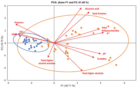 In order to better understand the differences between ancestral and traditional sparkling wines, a principal component analysis was performed. Figure 9 shows the plot of varimax-rotated corresponding to the principal components analysis. The first component (PC1) explains 45.71% of the variance, and the second (PC2) explains 15.75% (so the explained aggregate variance was 61.46% for the two components). The loadings are presented as arrows, the length and direction of which indicate the contribution made by both components. PC1 showed a significant correlation with all variables except total higher alcohol acetates. Specifically, PC1 was positively correlated with gluconic acid, total proteins, total polysaccharides, CieL*a*b* b* parameter, pH, turbidity and total higher Alcohols. In turn, PC2 showed a positive significant correlation with gluconic acid, total proteins and pressure and a negative significant correlation with total higher alcohol acetates, total higher alcohol concentrations and turbidity. With regard to the different variables, total polysaccharides, b*, pH, turbidity and total higher alcohol concentrations showed a strong negative correlation with HM, SO2 and pressure. In addition, gluconic acid and total proteins had a negative correlation with total higher alcohol acetates.
