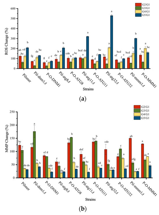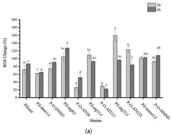 MMP is crucial for mitochondrial function, with higher levels indicating a stronger vitality. As shown in Figure 3b, after 6 h treatment with 4 mmol/L H2O2, the MMP value of Pilsner reduced to 69%, while the MMP levels of the overexpressed ATG8 and ATG11 strains increased to 150% and 153% of their initial states, respectively. The MMP level of P-O-ATG32 reduced to 82% after 6 h of treatment, which was still higher than that of the Pilsner strain. The disruption of ATG8, ATG11, and ATG32 caused a similar MMP reduction to the Pilsner. Meanwhile, DNM1 and MMM1 modifications caused a greater decline in MMP levels than the Pilsner. The results indicated that the overexpression of ATG8, ATG11, and ATG32 would help to maintain a high mitochondrial vitality under oxidative stress.