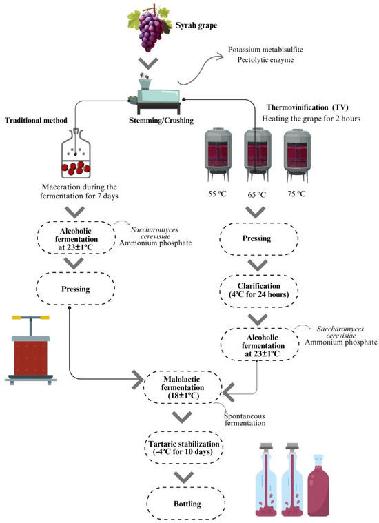 The red wines were made through microvinification in 10-litre glass carboys with glass air-lock valves. The Syrah grapes were first homogenised and equally divided into each of the following treatments, as illustrated in Figure 1: thermovinification at 55 °C (TV55), thermovinification at 65 °C (TV65), thermovinification at 75 °C (TV75), and traditional winemaking (TW—control). All microvinifications were conducted in triplicate.