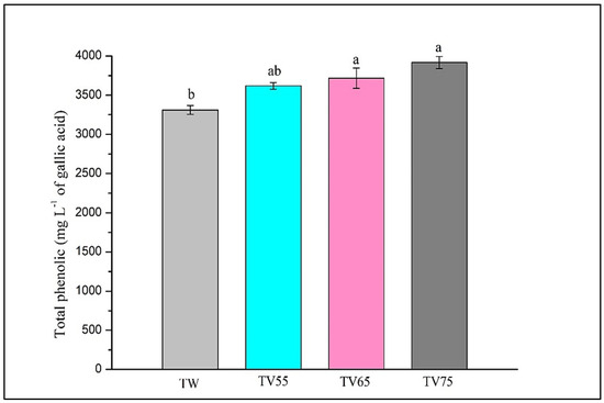 Total phenolic content measured using the Folin–Ciocalteu reducing capacity expressed in mg/L of gallic acid. Samples: TW, Syrah wine winemaking using traditional maceration; TV55, Syrah wine winemaking using thermovinification at 55 °C for 2 h; TV65, Syrah wine winemaking using thermovinification at 65 °C for 2 h; and TV75, Syrah wine winemaking using thermovinification at 75 °C for 2 h. Different letters indicate a significant difference between samples according to Tukey’s test (p ≤ 0.05).
