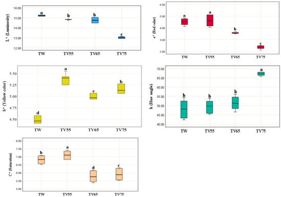 The results of the colorimetric analyses (CIELab and CIEL*C*h systems) of the wines are shown in Figure 3. The use of thermovinification reduced Syrah wine luminosity (L*), making it darker, with the reduction in luminosity being proportional to the increase in temperature, ranging from 13.02 in TV75 to 14.83 in TV55. When analysing the luminosity of Cabernet Sauvignon wines subjected to thermovinification (70 °C/30 min), El Darra et al. [46] found a value of 19.70; however, it did not differ significantly in relation to the control (23.35).