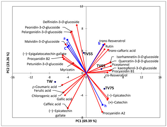 PCA was performed to explain the influence of the thermovinification temperature on the phenolic composition and colour of Syrah wines (Figure 4). The first principal component (PC1), which explained 69.39% of the sample variability, was responsible for separating the wines from the control treatment (TW) and TV55 from the wines from TV65 and TV75. This indicates that wines from TW and TV55 were more similar to each other, just as wines from TV65 and TV75 were more similar to each other.