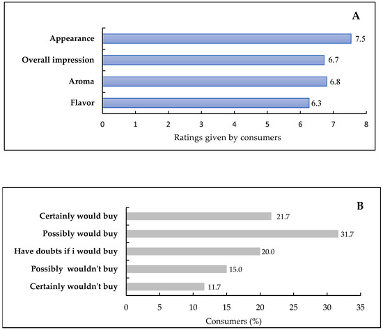Figure 5A shows the data from the acceptance means using a nine-point hybrid hedonic scale. Wine appearance had the highest score (mean score: 7.5), followed by aroma, overall impression, and flavour (mean scores: 6.8, 6.7, and 6.3, respectively). These data indicated a good prospect for thermovinification Syrah wines. Additionally, the largest percentage of consumers (53.4%) expressed a positive intention to buy the 65 °C-thermovinified wine (21.7% would definitely buy, and 31.7% would possibly buy), while 26.7% of respondents indicated no interest in purchasing (Figure 5B).