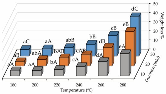 Weight loss of oak chips after toasting. Different lowercase letters indicate the differences between the toasting temperatures for the same duration of toasting (p < 0.05). Different capital letters indicate the differences between the different durations of toasting at the same temperature (p < 0.05).