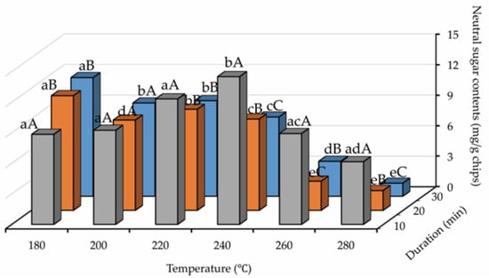 Amounts of neutral sugars extracted from oak chips on day 21. Different lowercase letters indicate the differences between the toasting temperatures for the same duration of toasting (p < 0.05). Different capital letters indicate the differences between the different durations of toasting at the same temperature (p < 0.05).
