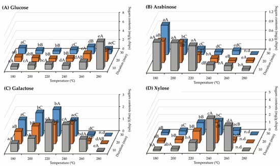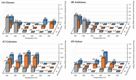 Amounts of monosaccharides extracted from oak chips: (A) glucose; (B) arabinose; (C) galactose; (D) xylose. n.d.: not detected. Different lowercase letters indicate the differences between the toasting temperatures for the same duration of toasting (p < 0.05). Different capital letters indicate differences between different durations of toasting at the same temperature (p < 0.05).