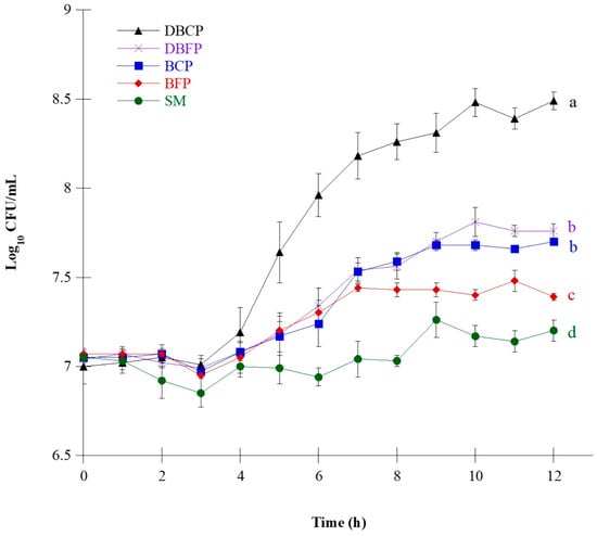 Limosilactobacillus fermentum J24 growth during fermentation of different beverages. DBCP = dairy beverage with 5% control puree, DBFP = dairy beverage with 5% FVE puree, BCP = beverage with 5% control puree, BFP = beverage with 5% FVE puree, SM = reconstituted skim milk. The results plotted represent the mean ± SD of three independent experiments with triplicate analysis. Different letters indicate significant differences at the end of fermentation (p < 0.05).