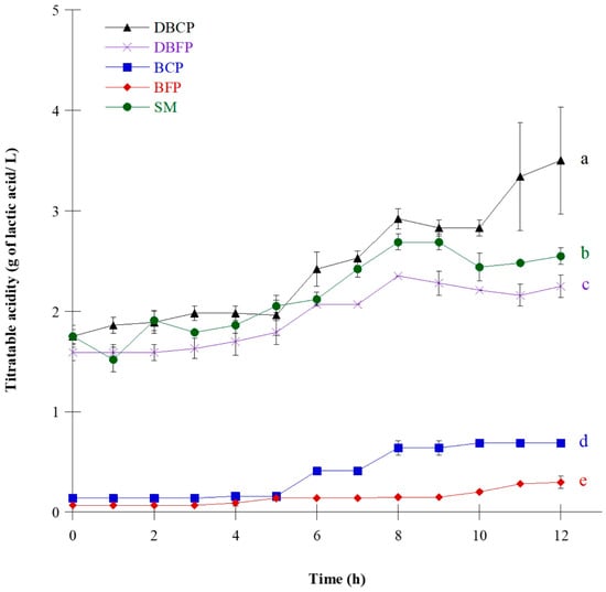 pH is an important parameter for monitoring the progress of lactic acid fermentation, as it reflects the metabolic activity of the microorganism in the production of organic acids, mainly lactic acid. In Figure 3, treatments DBCP, DBFP, and SM showed an initial pH in the range of 6.68–6.90, while in BCP, it was 5.05 ± 0.02, and in BFP, it was 6.36 ± 0.04. In all cases, a decrease in pH was observed. In the case of DBCP, this reduction was ca. 0.92 pH units, which was greater than the decrease observed in DBFP (ca. 0.40 units) (p < 0.05). On the other hand, in SM, the pH reduction was lower (p < 0.05) than in treatments involving the mixture of milk and papaya (DBCP and DBFP). Regarding beverages containing only papaya puree (BCP and BFP), a more pronounced reduction (p < 0.05) in pH levels was recorded (ca. 1.22 and 1.61 pH units, respectively).
