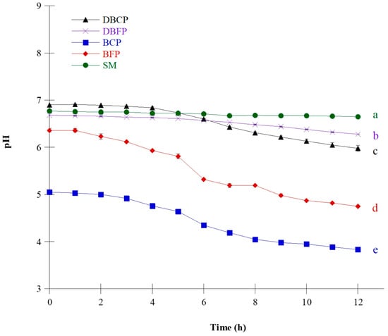 pH changes in different beverages fermented with Limosilactobacillus fermentum J24. DBCP = dairy beverage with 5% control puree, DBFP = dairy beverage with 5% FVE puree, BCP = beverage with 5% control puree, BFP = beverage with 5% FVE puree, SM = reconstituted skim milk. The results plotted represent the mean ± SD of three independent experiments with triplicate analysis. Different letters indicate significant differences at the end of fermentation (p < 0.05).