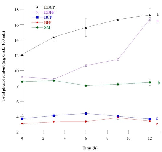 Phenolic compounds are phytochemicals found in most plant tissues. These compounds possess aromatic rings with one or more hydroxyl groups that can act as inhibitors in forming free radicals [46]. Therefore, the presence of these compounds in the papaya dairy beverages and their impact on them by Limosilactobacillus fermentum J24 was evaluated. Figure 4 presents the phenolic content of the five treatments evaluated at times 0, 3, 6, 9, and 12 h of fermentation. At the beginning of fermentation, it was observed that DBCP had a higher concentration (p < 0.05) than DBFP, with values of 12.10 ± 0.04 and 9.20 ± 0.04 mg GAE/100 mL, respectively. Additionally, DBFP was similar (p > 0.05) to SM, with a value of 8.55 ± 0.11 mg GAE/100 mL in the latter. On the other hand, both BCP and BFP showed the lowest total phenolic content (p < 0.05) and were similar to each other (p > 0.05), with values of 3.73 ± 0.57 and 3.09 ± 0.02 mg GAE/100 mL, respectively.