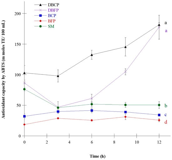 Antioxidant capacity relies on the mechanism of electron and proton transfer, where an antioxidant molecule (e.g., phenolic compounds) donates an electron or proton to a free radical (DPPH or ABTS), resulting in observable reducing capacity through the decrease in radical color [61]. Regarding ABTS, Figure 5 illustrates the antioxidant capacity of the five treatments evaluated at 0, 3, 6, 9, and 12 h of fermentation. At the onset of fermentation, differences are observed among all treatments (p < 0.05). DBCP exhibits the highest capacity, with a value of 103.03 ± 11.93 mmol TE/100 mL. DBFP, BCP, BFP, and SM show values of 86.52 ± 1.49, 32.03 ± 4.14, 18.55 ± 0.36, and 76.38 ± 3.19 mmol TE/100 mL, respectively.