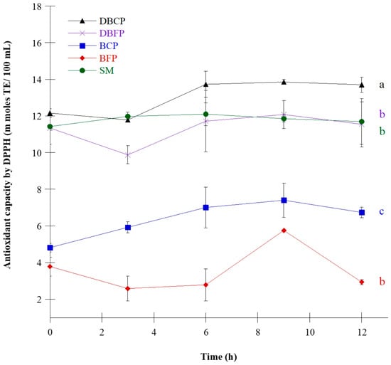 During fermentation, DBCP increases (p < 0.05) its antioxidant capacity ca. 1.13 times at 6 h, remaining stable (p > 0.05) until 12 h (13.70 ± 0.41 mmol TE/100 mL). DBFP and SM do not change (p > 0.05) during fermentation, with values of 11.55 ± 1.23 and 11.70 ± 1.25 mmol TE/100 mL, respectively. In the case of BCP, an increase (p < 0.05) is observed at 3 h, remaining constant until 12 h, with a final value of 6.73 ± 0.28 mmol TE/100 mL. On the other hand, BFP shows an increase (p < 0.05) at 9 h, followed by a decrease (p < 0.05) at 12 h, with a final value of 2.93 ± 0.14 mmol TE/100 mL.