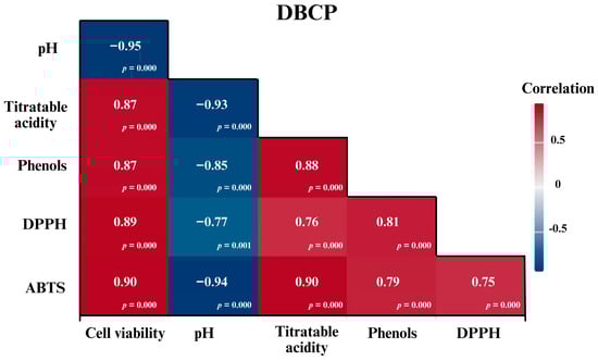 The correlation of all the variables evaluated during fermentation was determined for each treatment. Figure 7 shows that at DBCP, cell viability showed a very strong positive correlation with titratable acidity, phenols, DPPH, and ABTS and a very strong negative correlation with the pH variable. Specifically, the pH variable showed a very strong negative correlation with the titratable acidity, phenols, and ABTS variables and a strong negative correlation with the DPPH variable. Titratable acidity showed a very strong positive correlation with phenols and ABTS and a strong positive correlation with DPPH. The concentration of total phenols showed a very strong positive correlation with DPPH and a strong positive correlation with ABTS. Finally, DPPH showed a strong positive correlation with ABTS. These correlations were statistically significant (p < 0.05).