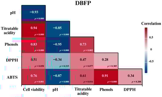 Correlogram with Pearson correlation coefficients between fermentation variables, antioxidant, and physicochemical properties at DBFP. Each rectangle indicates the r-value (Pearson correlation coefficient for a pair of variables) and the p-value.