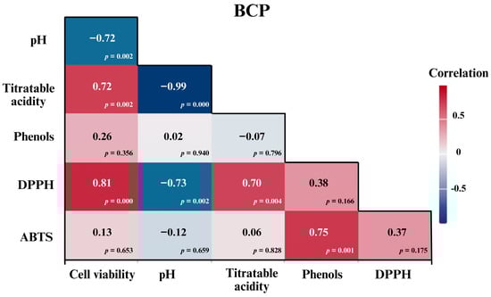 In Figure 9, in BCP, cell viability shows a very strong positive correlation with DPPH and a strong positive correlation with titratable acidity, while pH shows a strong negative correlation. However, cell viability exhibits a very weak positive correlation with ABTS and phenols, which is not significant (p > 0.05). Regarding pH, a very strong negative correlation is observed with titratable acidity and a strong negative correlation with DPPH. However, no significant correlations (p > 0.05) were found with phenols and ABTS, which were very weak positive and very weak negative, respectively. Titratable acidity shows a strong positive correlation with DPPH, while no significant correlations (p > 0.05) were found with phenols and ABTS. In the case of phenols, a strong positive correlation is only observed with ABTS, and a weak positive correlation with DPPH is not significant (p > 0.05). On the other hand, DPPH presents a weak non-significant correlation (p > 0.05) with ABTS.