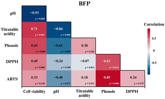 About BFP (Figure 10), it is observed that cell viability has a strong positive correlation with titratable acidity and phenols. In addition, it presents a weak positive correlation with ABTS and a moderate correlation with DPPH; however, in both cases, it is not significant (p > 0.05); cell viability presented a very strong negative correlation with pH. Continuing with pH, it exhibited a very strong negative correlation with titratable acidity and a strong negative correlation with phenols; on the other hand, it was not significant (p > 0.05) with DPPH and ABTS, presenting a weak negative correlation and a moderate negative correlation, respectively. In the case of titratable acidity, no significant correlations (p > 0.05) were found with phenols, DPPH, and ABTS, showing a weak positive correlation, a very weak negative correlation, and a very weak positive correlation, respectively. On the other hand, phenols show a strong positive correlation with DPPH and a very strong one with ABTS. Finally, the correlation between DPPH and ABTS was weakly positive and not significant (p > 0.05).