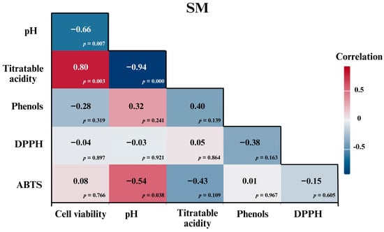 Figure 11 shows the correlation between all variables in SM. Cell viability shows a very strong positive correlation with titratable acidity, while pH shows a strong negative correlation. However, the correlation of cell viability with phenols, DPPH, and ABTS is not significant (p > 0.05), showing a weak negative, very weak negative, and very weak positive correlation, respectively. Regarding pH, a very strong negative correlation is observed with titratable acidity. In contrast, no significant correlations (p > 0.05) were found with phenols (weakly positive), DPPH (very weak negative), and ABTS (very weak negative). In the case of titratable acidity, no significant correlations (p > 0.05) were found with phenols, DPPH, and ABTS, showing a moderate positive correlation, a very weak positive correlation, and a moderate negative correlation, respectively. A non-significant (p > 0.05) weak negative correlation with DPPH and a very weak positive correlation with ABTS was observed for phenols. Finally, the correlation between DPPH and ABTS was weak, negative, and not significant (p > 0.05).
