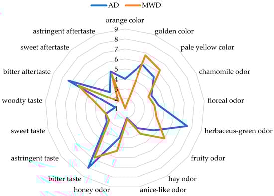 QDA spider plot of significant descriptors of fig leaf herbal teas. AD: air-dried fig leaf herbal tea. MWD: microwave-dried fig leaf herbal tea. Numbers from 1 to 9 refers to sensory scores where 1 (absence of sensation) and 9 (extremely intense).