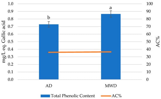The total phenolic content was higher in MWD samples than in AD ones (p < 0.05), while the antioxidant capacity showed similar values with no statistically significant differences (p > 0.05).