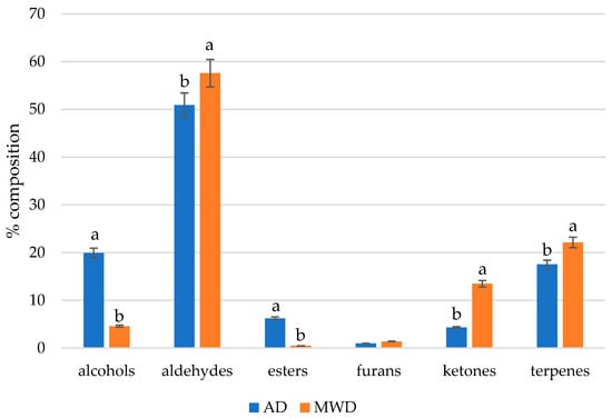 Volatile percentage composition as classes of substances of fig leaf herbal teas. AD: air-dried fig leaf herbal tea. MWD: microwave-dried fig leaf herbal tea. Different letters in the same class of substances indicate statistically significant differences at p < 0.05 by Duncan’s test.
