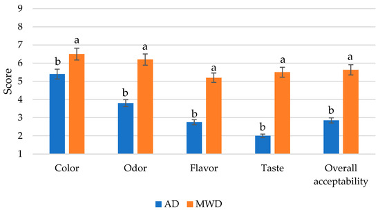Consumer acceptability of fig leaf herbal teas. 1: extreme dislike, 9: extreme appreciation. AD: air-dried fig leaf herbal tea. MWD: microwave-dried fig leaf herbal tea. Different letters for the same attribute indicate statistically significant differences at p < 0.05 by Duncan’s test.