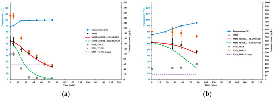 Process temperature, SMM, free and total DMS, along with a standard model for SMM and a reference model with SMM half-life reduced to by 70%, and a reference target concentration of 60 μg/L for total DMS, against process time: (a) trial STD1; (b) trial STD2.