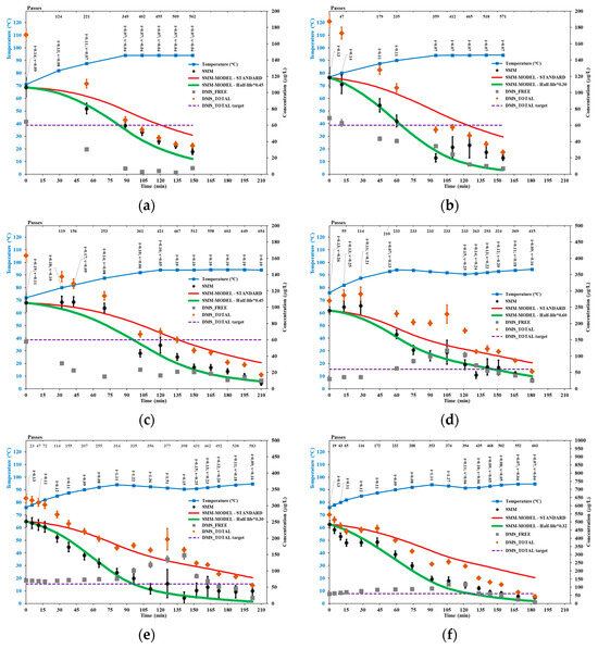 Figure 3 shows the results of brewer’s wort boiling trials STD1 and STD2, aimed at checking the standard model for the SMM conversion reaction, as represented in Equations (6) and (7). Conservatively, the concentration levels shown for the considered quantities did not consider the water evaporation that occurred during the trials (assessed between 1.5% and 4.5% based on the change in Plato degree), i.e., only directly measured data are shown.