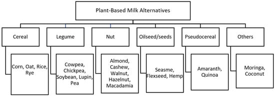 Plant-based milk alternatives (PMAs) are non-dairy substitutes derived from a wide variety of plant sources, including grains (e.g., rice, quinoa, oats), legumes (e.g., soy, peas), nuts (e.g., cashew, almond, macadamia), and seeds (e.g., hemp, flax, sesame) (Figure 1). Among the available PMAs, soy, almond, oat, and coconut milks are the most extensively produced and consumed globally [1,2]. The global market for PMAs, valued at USD 12.1 billion, is projected to grow to approximately USD 29.5 billion by 2031, reflecting a compound annual growth rate (CAGR) of 9.5%. There are several new types of PMAs coming to the market, including new blends; however, almond and soy milk dominate the market, each holding approximately 40%, while other PMAs (including rice, oat, coconut, and pea) account for the remaining share [1,3].