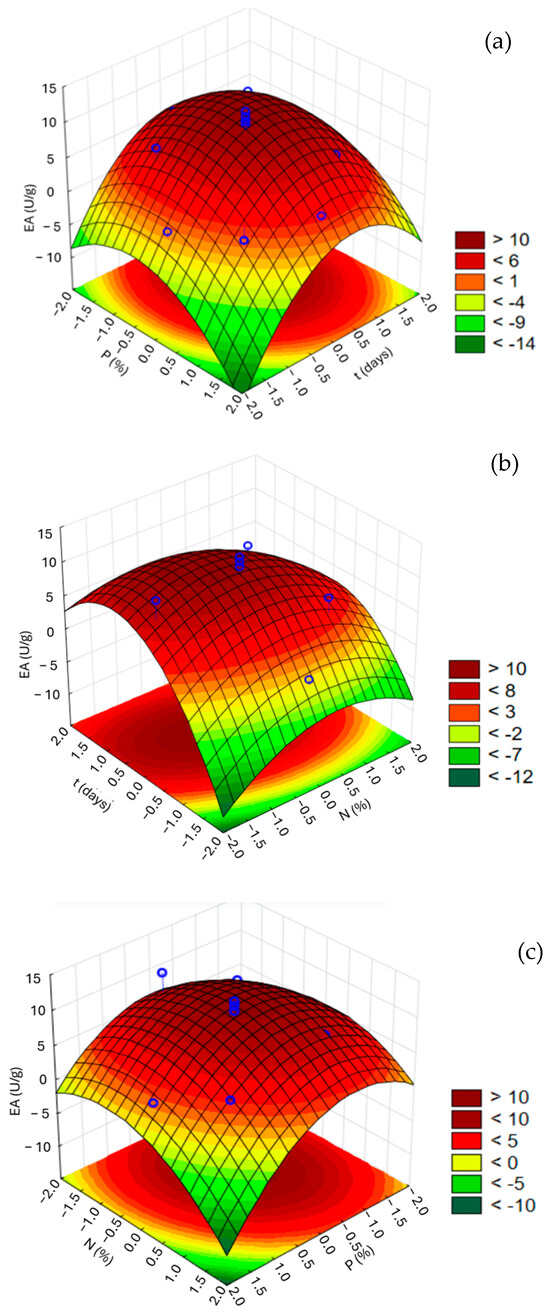 Solid-phase bioprocesses require the optimization of cultivation conditions for enzyme production, as the residue used may not contain all the nutrients needed for fungal growth [23,27]. The centesimal composition of cupuaçu peel was evaluated in a previous study, in which it was used for the production of fungal cellulase [21]. This residue has a high fiber concentration and low lipid and protein content. Regarding the inorganic composition of cupuaçu peel, essential elements for microbial growth were found early, such as potassium (2.96 ppm), magnesium (2.78 ppm), sulfur (2.20 ppm), phosphorus (0.40 ppm), calcium (209 ppb), iron (124 ppb), zinc (99 ppb), sodium (90 ppb), copper (72 ppb), and manganese (10 ppb). Thus, after preliminary tests [31], phosphorus and nitrogen sources, as well as the fungal cultivation time, were identified as the most important variables for pectinase production by A. brasiliensis using cupuaçu peel as a substrate, and therefore, in our study, we investigated the best conditions through a CCD.