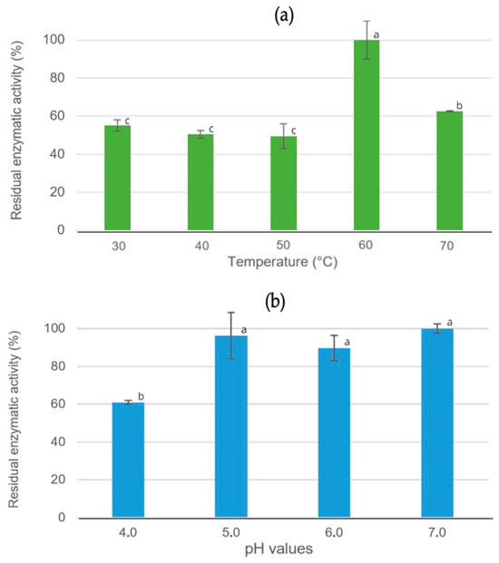 In the assays determining the optimal pH value for the pectinolytic activity of the crude extract, it was observed that pH 7.0 provided the highest polygalacturonase activity; however, there was no statistical difference between pHs 5.0 and 6.0 (p < 0.05). Thus, this result demonstrated that the enzyme has a high enzymatic activity between a considerable pH range (pH 5.0 to 7.0) (Figure 2b). In addition, for acidic conditions (pH 4.0), a significant reduction in enzymatic activity was detected (only an average residual enzymatic activity of 60%).