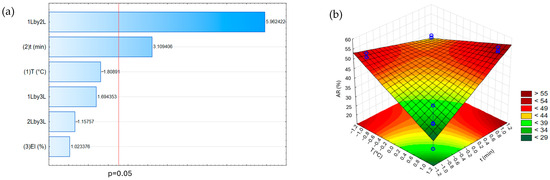 In the Pareto diagram (Figure 3a), it can be observed that the interaction between the clarification time and temperature, as well as time alone, showed statistical significance (p < 0.05), both with a positive effect on reducing the absorbance at 400 nm of the cupuaçu juice. Figure 3b shows the response surface graph with the interaction between the incubation time and clarification temperature and where two regions of greater absorbance reduction are observed, i.e., low temperatures and low incubation times, and with higher values of both variables T (the temperature of the clarification) and t (the time of the clarification). Considering that the polygalacturonase activity of the enzymatic extract produced by A. brasiliensis is maximal at 60 °C, conducting the clarification process at this temperature would be ideal. However, the Pareto diagram shows that temperature has a negative effect on enzymatic clarification (measured by absorbance reduction at 400 nm), although it did not show a statistically significant effect (p < 0.05).