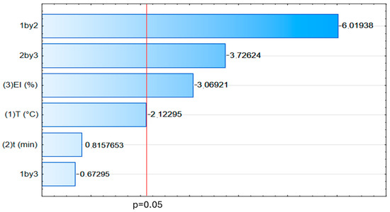 Pareto chart for the effects of independent variables on the antioxidant activity of the clarified cupuaçu juice; 1 = temperature of the clarification process (T); 2 = time of the clarification process (t); and 3 = enzyme loading (El).