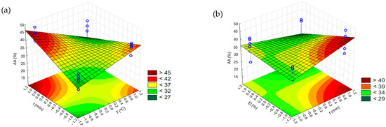 The enzyme load and the temperature were significant (p < 0.05), with a negative effect on antioxidant activity, meaning lower enzyme concentrations and lower temperatures increase the antioxidant activity of cupuaçu juice. Additionally, two interactions showed statistical significance: the clarification time and temperature and the clarification time and enzyme load used in the process, both with a negative effect. In Figure 5, the response surface graphs of the interactions between the temperature and clarification time and between enzyme loading and clarification time (Figure 5a and Figure 5b, respectively) are shown, as well as their effects on antioxidant activity. For the interaction between temperature (T) and the time of the clarification process (t), it is observed that the longer incubation time and the lower temperature used in the process induced a greater antioxidant activity in the clarified juice. For the interaction between the time of clarification (t) and enzyme loading (El), it is observed that extended clarification times and lower enzyme loads improved the antioxidant activity.